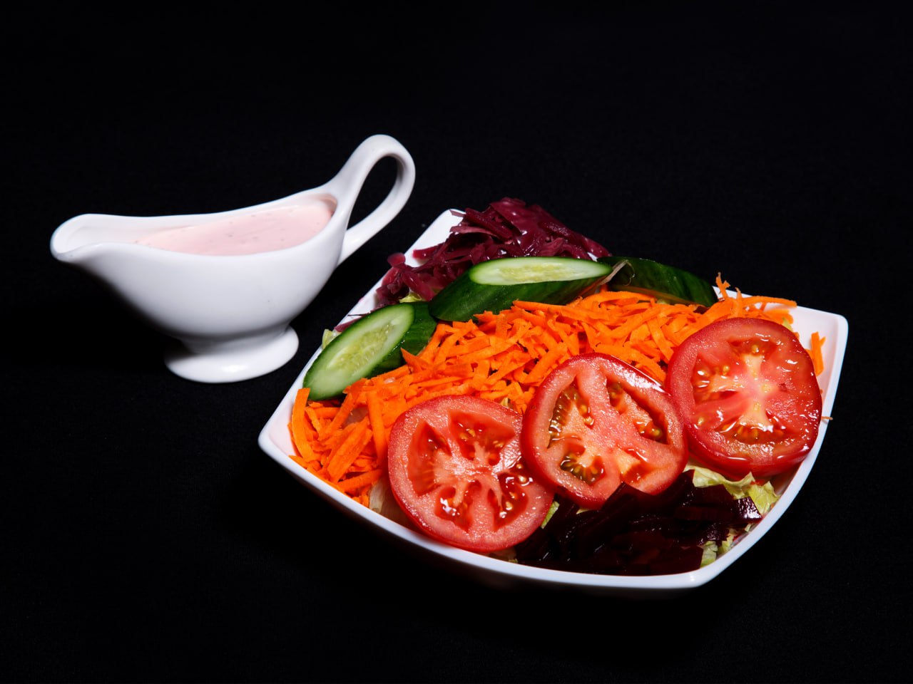 Fresh Lettuce Varieties , Tomatoes , Beetroot, Cucumber, Carrot Strips & Yogurt Dressing